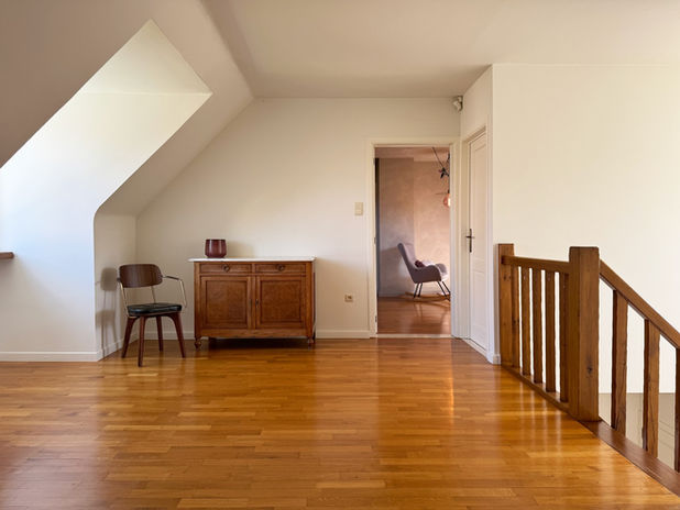 Op de eerste verdieping komen we aan op een royale overloop die perfect ingericht worden als extra werk- of ontspanningsruimte.